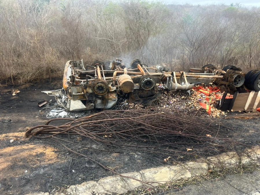 Um caminhão de placa OVO-0203, cor branca, capotou e foi consumido pelo fogo na manhã desta quarta-feira, 19 de novembro de 2025, na BA-026, nas proximidades do km 200, em Planaltino-Ba, no Vale do Jiquiriçá. O veículo seguia pelo trecho entre Maracás e Nova Itarana quando o motorista perdeu o controle da direção.