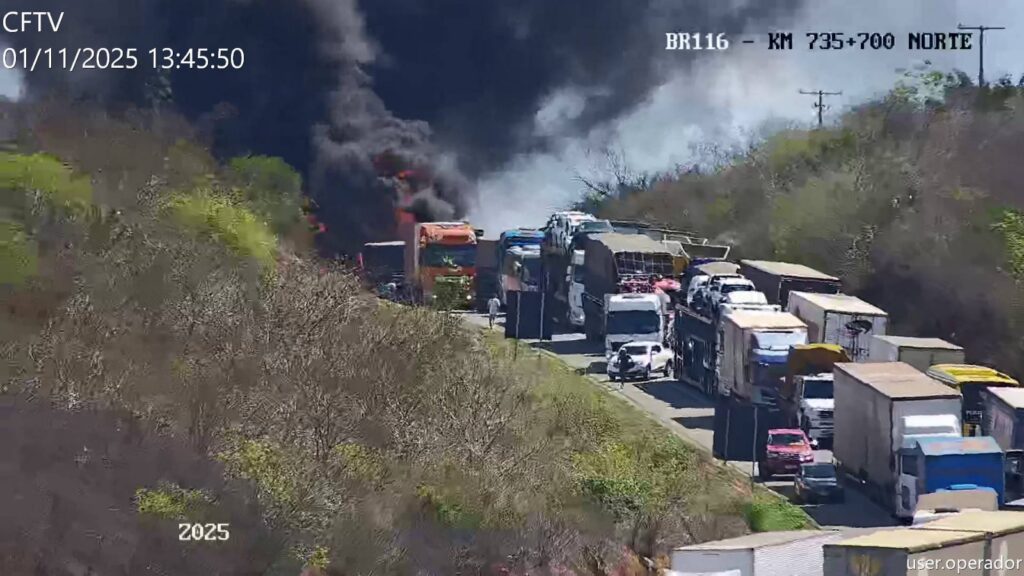 Um grave acidente foi registrado na tarde deste sábado (01/11/25) na BR-116, no trecho que liga os municípios de Boa Nova e Poções, no Sudoeste baiano. Duas carretas colidiram lateralmente e, em seguida, um incêndio de grandes proporções tomou conta da pista após o reservatório de combustível de um dos veículos, um caminhão-tanque, estourar.As chamas se alastraram rapidamente e consumiram por completo as duas carretas. Apesar da gravidade da ocorrência, os motoristas conseguiram sair dos veículos a tempo e não sofreram ferimentos. Equipes do Corpo de Bombeiros e da concessionária responsável pela rodovia atuaram no combate ao fogo e na interdição total da via, necessária para garantir a segurança e permitir o trabalho das equipes de emergência.