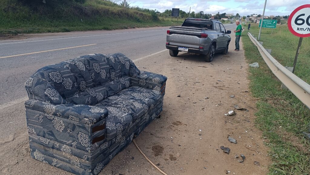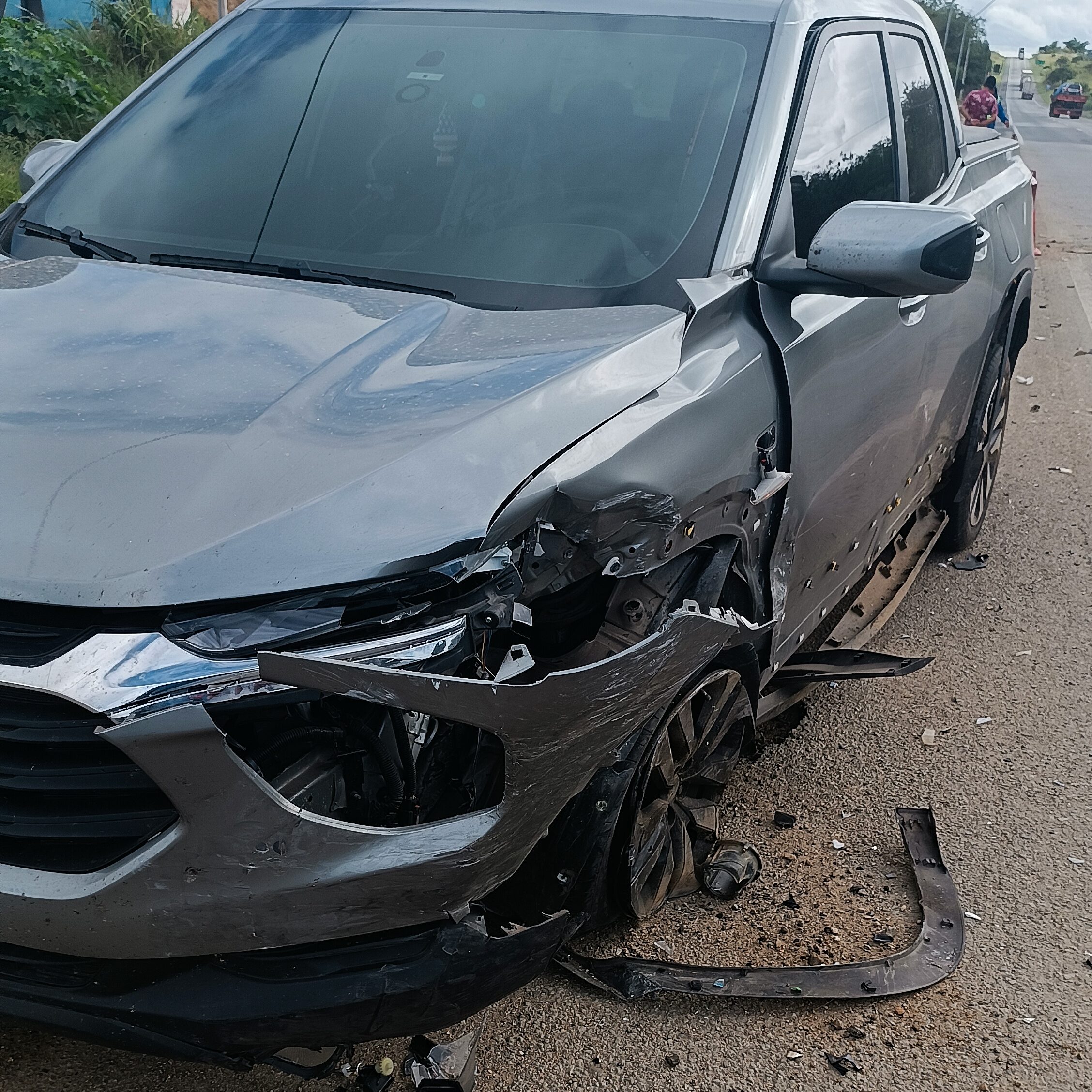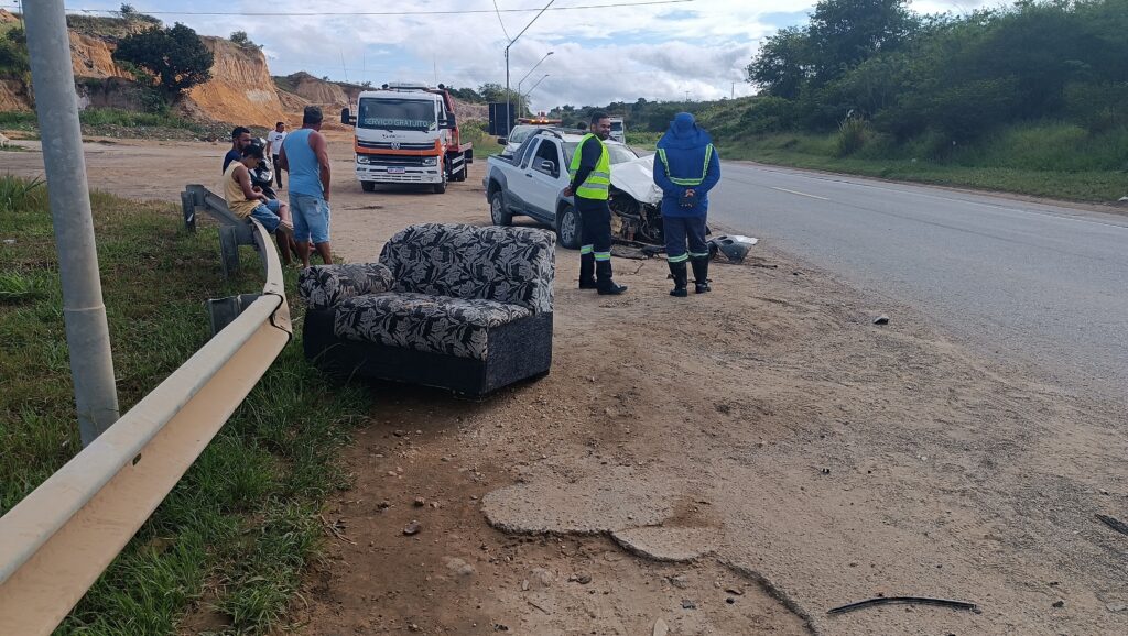 Um acidente do tipo colisão aconteceu na BR-116 no Entroncamento de Jaguaquara, nas proximidades do bairro Terrabrás, na manhã desta quarta-feira (16/04). Um veículo Fiat Strada branca, que seguia no sentido Norte, invadiu a pista contrária, ao fazer uma conversão na entrada do lava-jato, quando foi atingido por uma Picape Chevrolet Montana que seguia de Alagoas para São Paulo. Na picape Strada, seguiam dois homens; o motorista, identificado como Benedito e o carona, identificado como Cosme. Eles transportavam sofás para um sítio na região.