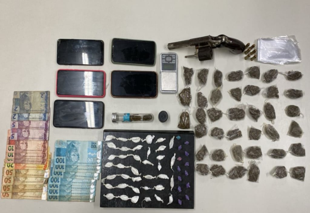 Os policiais da 3CIAPM do 19°BPM, após o recebimento de denúncias, iniciaram diligências nesta sexta-feira (28/02/25) e, atestando a veracidade das informações, prenderam dois homens em flagrante por tráfico de drogas e porte ilegal de arma de fogo. Segundo as informações policiais, os autores fazem parte de uma facção e com eles foram apreendidos: 01 revólver, calibre .38; 06 munições do mesmo calibre; 39 porções de maconha; 13 porções de crack; 38 porções de cocaína; R$ 964,00 em espécie; 01 balança de precisão; 05 aparelhos celulares; e sacolés para comercialização de drogas.Todos foram encaminhados para apresentação à Autoridade competente, para adoção das medidas legais pertinentes.